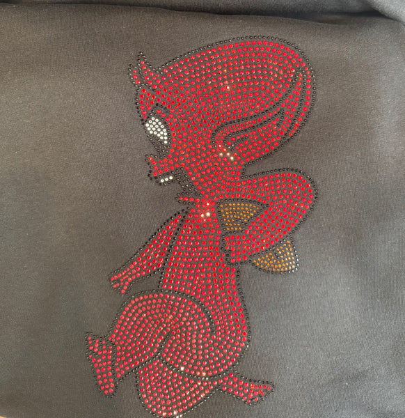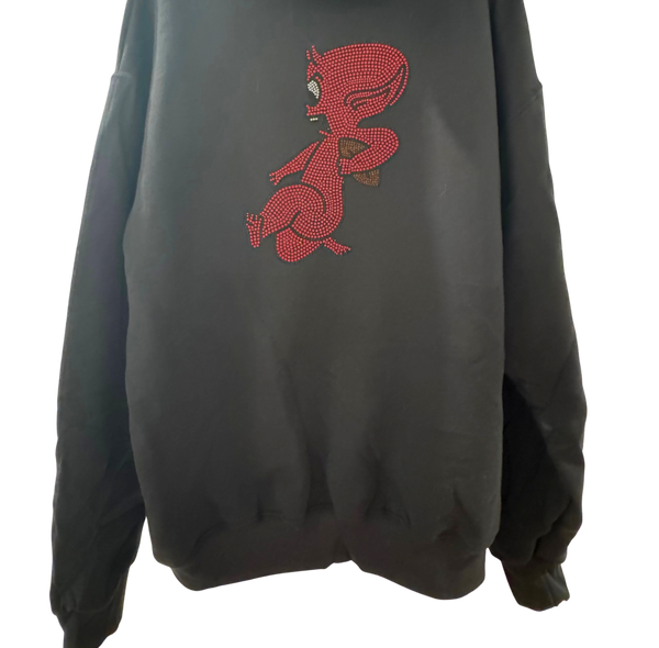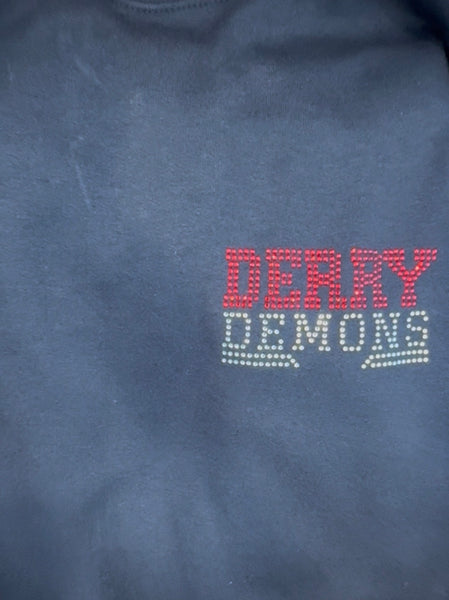 Derry Demons bling lettering on front and football demon mascot on back of a black crewneck sweatshirt.