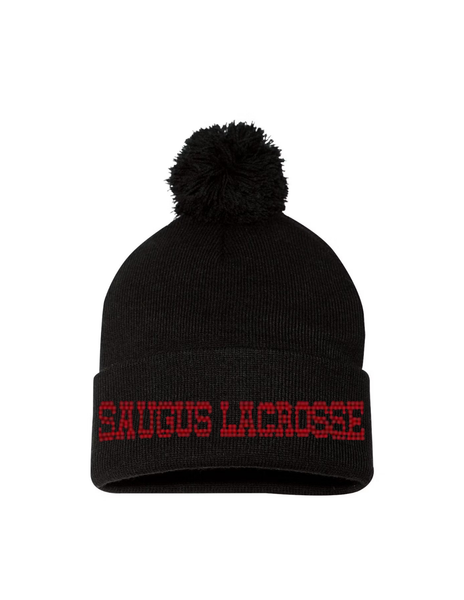 Saugus Lacrosse on a 12" black knit hat with pom-pom. Option 1 Bling Lettering in all Rhinestones and Option 2 DTF Lettering (no bling).